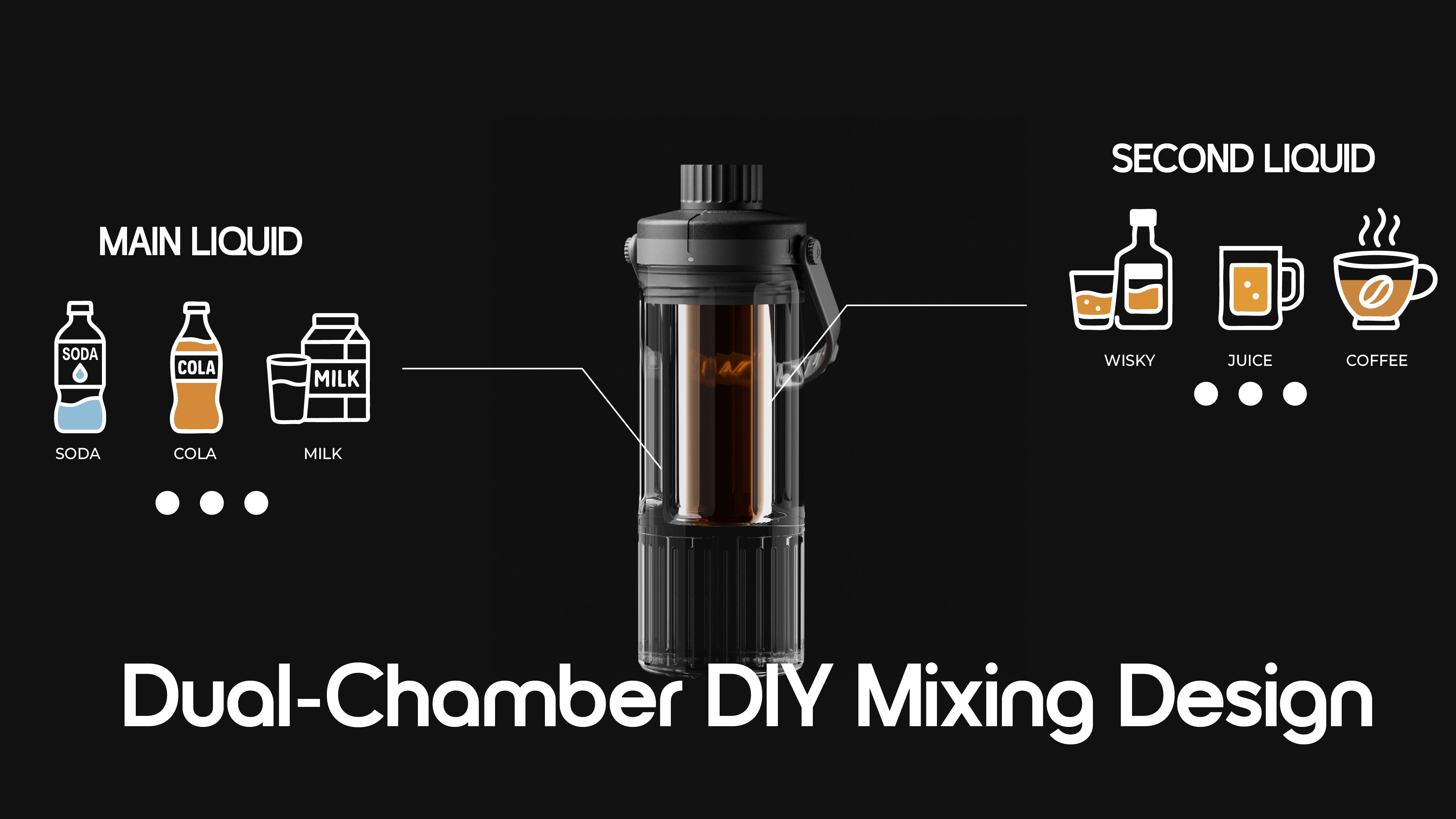 One lid, two flavors. Mix spirits, coffee shots, or concentrates with soft drinks at your command. Just twist and sip.
